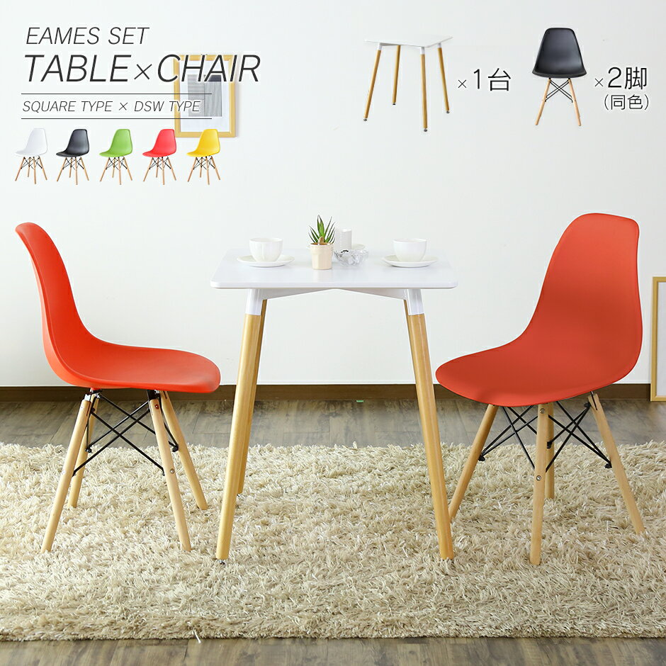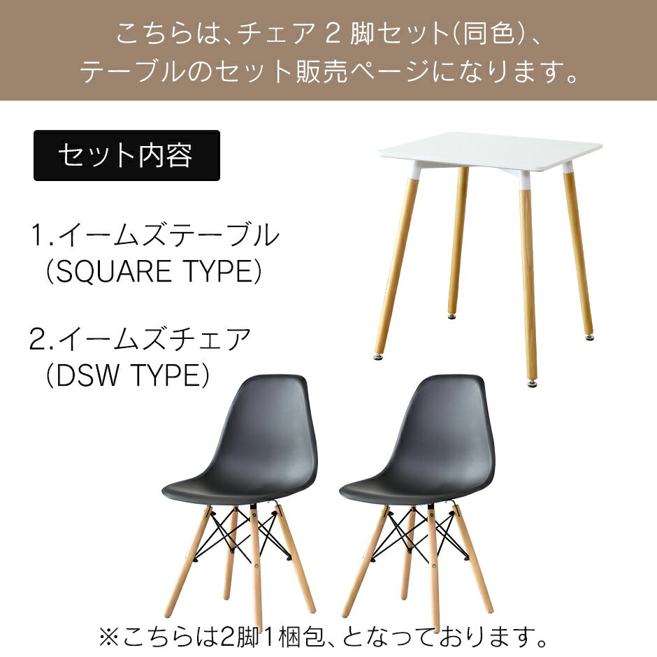 ●商品詳細 -infomation- 商品名 テーブル&チェア2脚セット DSW セット内容 商品名 デザインテーブル EDGE 【エッジ】 ■サイズ 本体サイズ:幅60×奥行60×高さ72(cm) ■梱包サイズ:幅65×奥行65×高さ14(cm) ■材質 MDF、ビーチ材 ■重量 本体:9kg ■梱包重量:10kg イームズ チェア2点セット DSW ◆サイズ 約幅46×奥行50×高さ82×座面高43.5(cm) ◆材質 【構造部材】ポリプロピレン 【張り材】天然木・スチール ◆重量 約3.5kg ◆耐荷重 約80kg ◆梱包サイズ 約幅44×奥行46×高さ50.5(cm) ◆梱包重量 約9.5kg (梱包材等含む) 備 考 ※他商品との同梱は出来かねます。